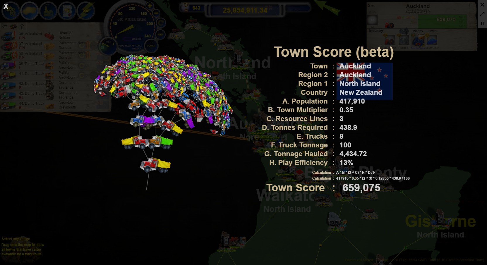 Clicking on the score of a completed town in the town popup window will show you a new window which gives you a breakdown of how the score was derived and an image of all the truck loads that were used to complete it. See attached image for detailed info.